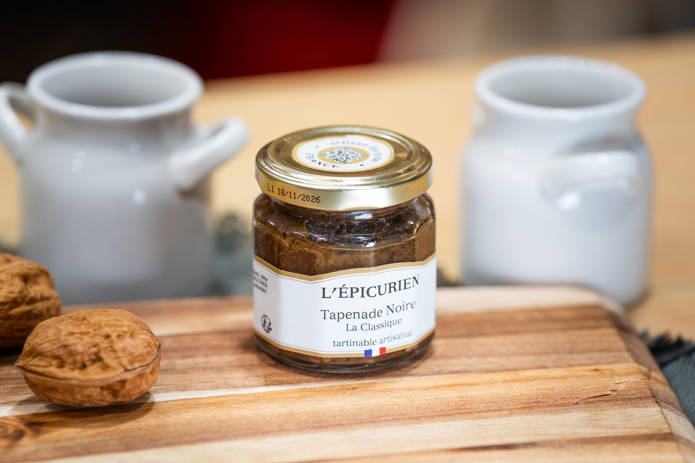 Olives noires 84% (origine non-UE), huile d’olive vierge extra, câpres, crème d’ANCHOIS (ANCHOIS, huile de tournesol, vinaigre de vin aromatisé, sel), ail, MOUTARDE en grains (eau, graine de MOUTARDE, vinaigre, sel), jus concentré de citron, antioxydant :