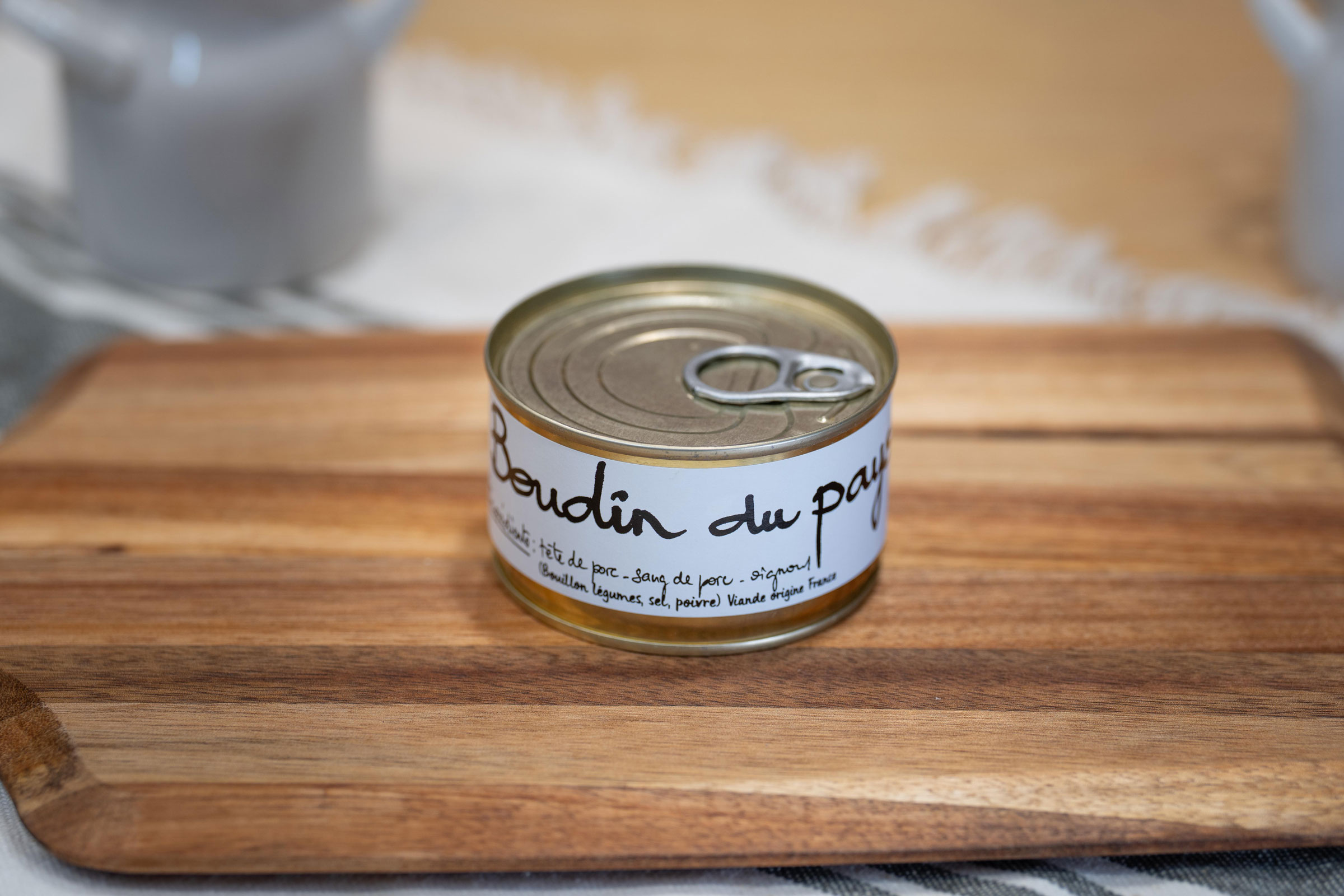 Boudin du Pays: Tête de porc, sang de porc, oignons,bouillon de légumes, sel, poivre. Viande origine France