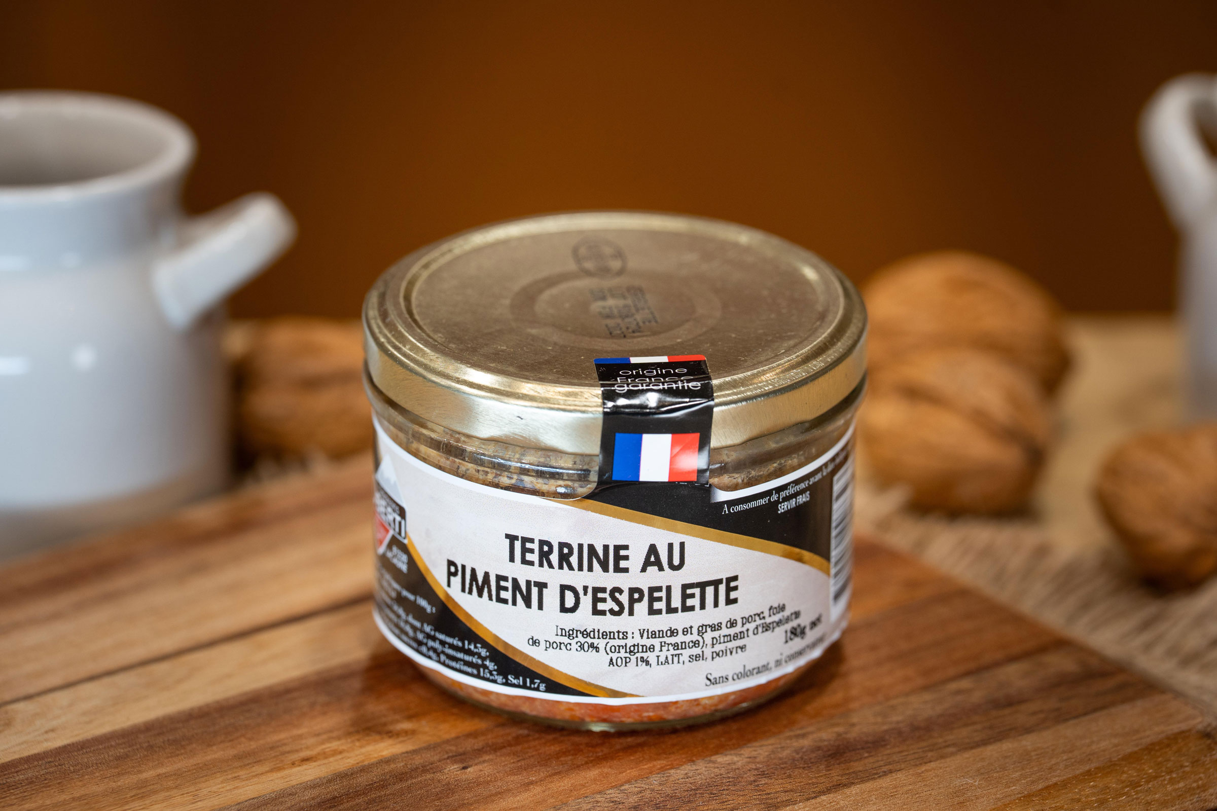 Terrine au Piment d’Espelette:Viande et gras de porc, foie de porc 30% (origine France), piment d’Espelette AOP 1%, LAIT, sel, poivre.