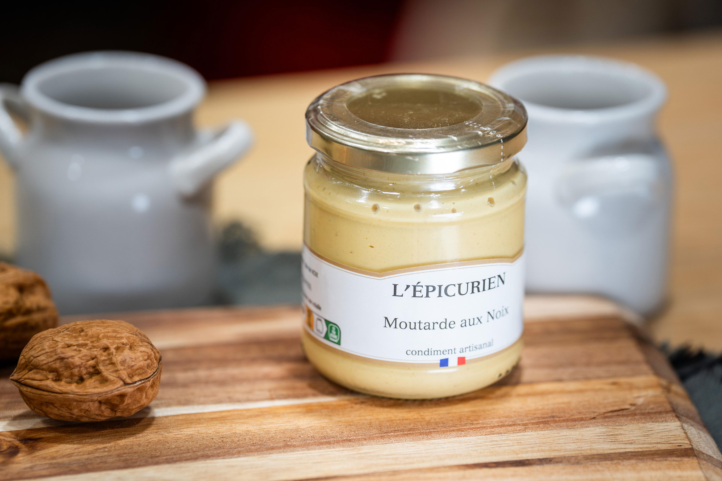 Graines de MOUTARDE (origine UE et non-UE), eau, vinaigre, pâte de NOIX 5% (NOIX cuites : 63%, eau, huile de tournesol, arôme), sel, sucre, arôme naturel (NOIX), conservateur SULFITE acide de sodium (SULFITES)
